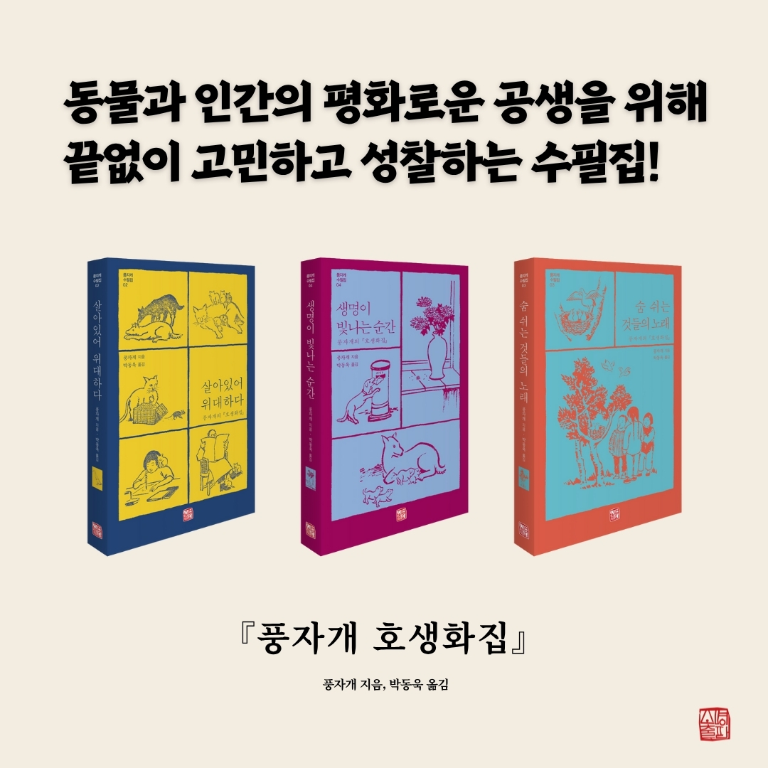 “생명을 보호하는 것이 곧 마음을 보호하는 것” “호생즉호심(護生即護心)” 사상으로 인간과 자연의 조화를 노래한다. 중국의 작가, 화가, 만화가, 예술이론가 등 다방면에서 활동한 거장 펑츠카이(풍자개豐子愷, 1898~1975)의 대표작인 『호생화집』이 마침내 한국 독자들을 만난다. 펑츠카이는 스승 홍일법사(弘一法師)의 권유를 받아 제작을 시작했으며, 그의 생애 동안 꾸준히 발전시켜 초집(初集) 출간(1929년) 이후 총 6집(1979년)에 걸쳐 완성된 불멸의 걸작이다.